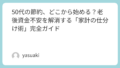 50代は「同じ50代」でも状況が全然違います。子どもが大学に入る人もいれば、定年が近づいている人もいる。自分がどのケースか、まず確認しましょう。