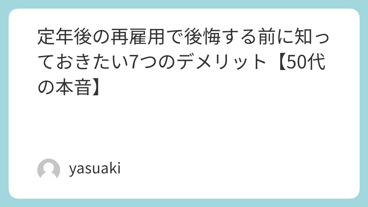 この記事では、再雇用制度のデメリットを数字と体験ベースで7つ解説したうえで、「それでも再雇用を選ぶべきか」「50代のうちにできることは何か」を具体的にお伝えします。定年まで5年以上ある方にも、来年60歳を迎える方にも、ぜひ最後まで読んでほしい内容です。