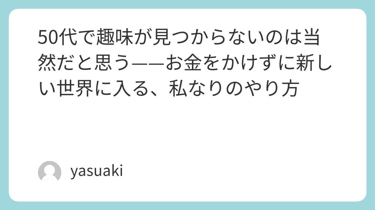 「50代 趣味」で検索すると、山ほどリストが出てきます。ウォーキング、ヨガ、読書、料理、ガーデニング、英語、カメラ……。どれも「なるほど」とは思うんですが、「やってみたい!」という気持ちにはなかなかなれない。