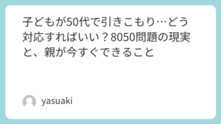 人間関係とこころ 子どもが50代で引きこもり…どう対応すればいい?8050問題の現実と、親が今すぐできること 50代の子どもが引きこもり…8050問題に直面している親に向けて、やってはいけない対応と正しい向き合い方をフェーズ別に解説。相談窓口・支援制度も網羅。 2026.03.17 人間関係とこころ暮らしを整える